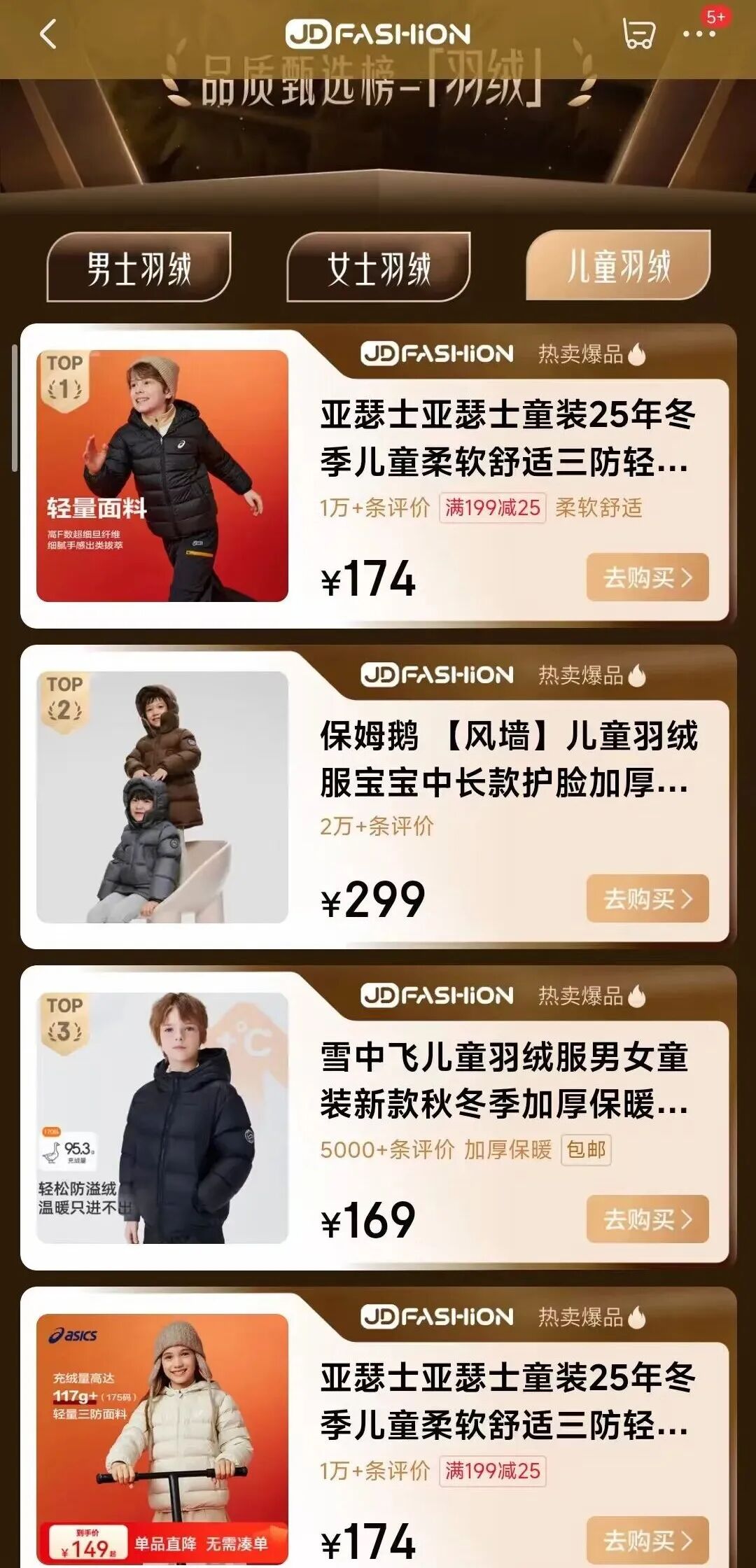 洞察到这些焦虑之后,一款亚瑟士儿童羽绒服卖到了京东JD FASHION品质甄选榜「儿童羽绒」类目的榜首。
