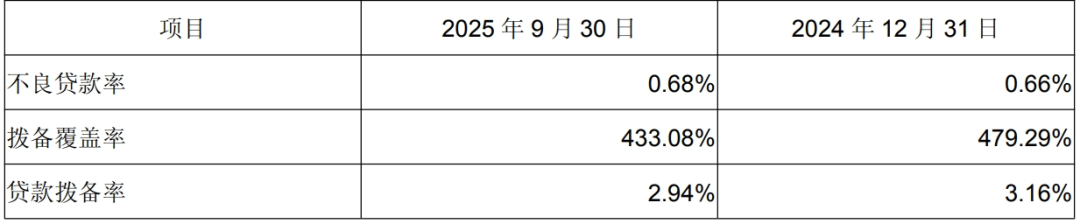 在盈利质量方面,前三季度归母净利润94.93亿元的增长,很大程度上依赖信用减值损失的压缩,该指标从去年的21.2亿元降至18.1亿元,拨备覆盖率同步下降46.21个百分点至433.08%,“拨备红利”的释放空间已所剩无几。