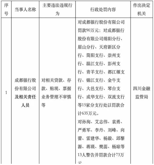 据国家金融监督管理总局官网罚单显示,成都银行因对贷款、存款、贴现、票据业务管理不审慎等违规行为,被国家金融监督管理总局四川监管局处以罚款90万元,其15家分支行被罚款合计635万元。
