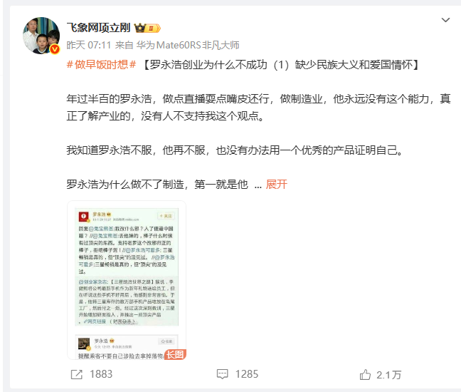 项立刚在微博长文中宣称:“我对他有个定论,他最强大的能力,除了做直播,他做什么都不会成功。” 紧接着就是一套“宿命论”组合拳,直指老罗“心比天高,命比纸薄”、“折腾半辈子干啥啥不成”,并断言他“很难有作为了”。