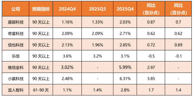 伴随业务收缩与合规整改,2025年四季度,行业风险指标整体上行,资产质量压力逐步显现,主要上市助贷平台逾期数据具体如下表所示。
