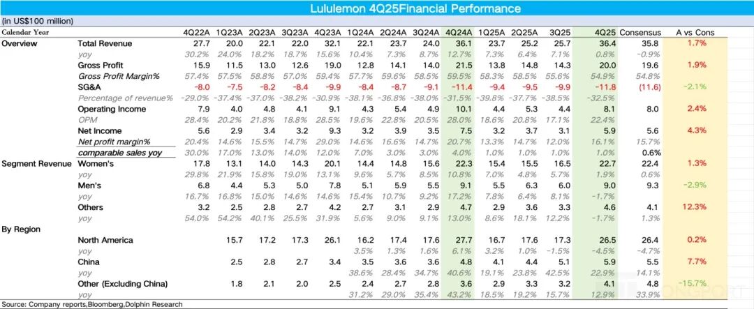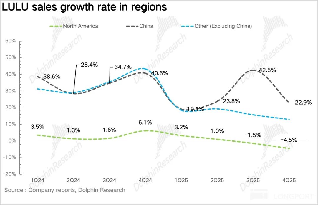 4Q25Lululemon 实现营收 36.4 亿美元,同比增长 0.8%,趋势上增速仍在放缓,增速为近 3 年以来最低水平。如果剔除去年同期多出的额外一周的影响,实际营收同比增长 6%,但也远低于过去几年 15% 以上的高速增长水平,核心还是北美大本营市场陷入了增长停滞。