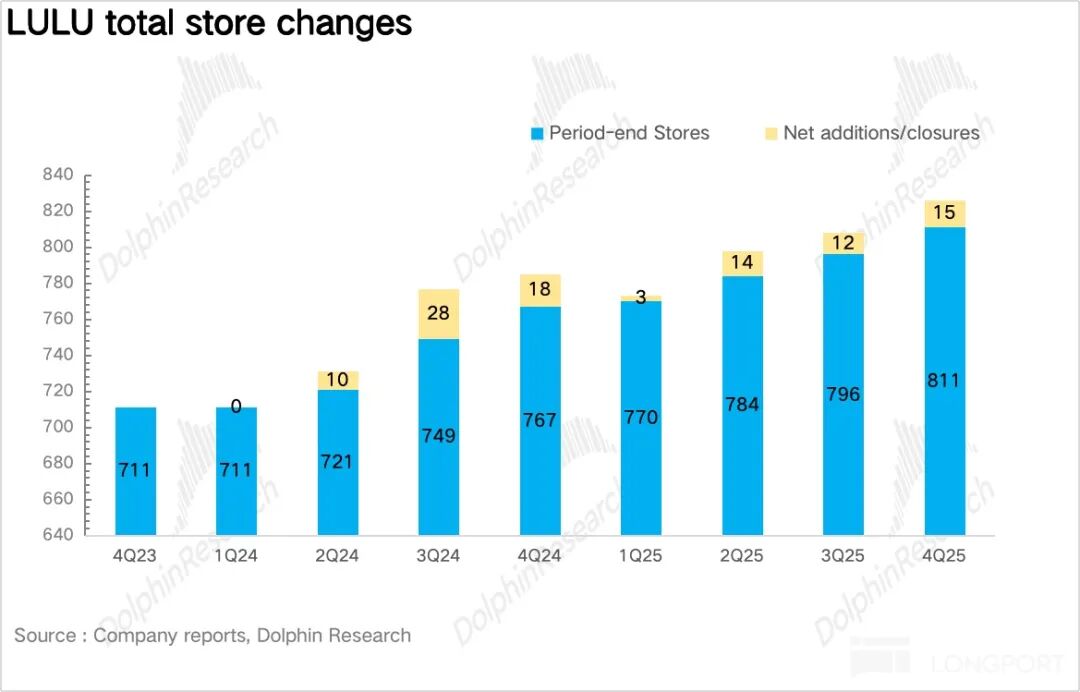 截至 4Q25,公司全球门店总数达 811 家,环比净新增 15 家,其中中国地区为开店主力,策略上以大店为主,除了在京沪等一线城市加密布局外,Lululemon 在 Q4 密集进驻了更多省会城市及核心二三城市(如昆明、徐州、呼和浩特等),另一方面,Lululemon 也针对老旧门店进行了扩容,搬迁到商场更核心、面积更大的位置,来展示全系列的鞋履、男装和高尔夫系列产品。