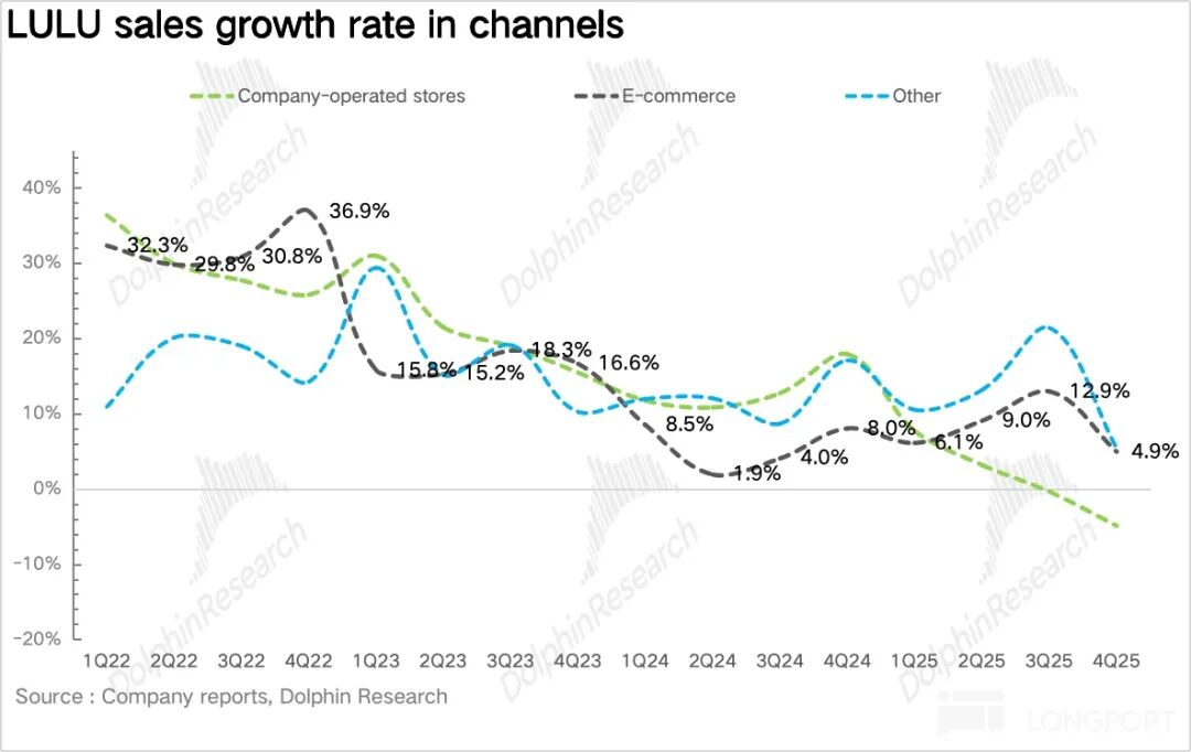 4Q25 男装同比增长 3%,表现一般。具体到品类上来看,在男装上,Lululemon 明显加大了专业场景的拓展,包括高尔夫、专业训练等细分赛道的产品,在海豚君看来,背后明显的意图在于刻意弱化 “瑜伽品牌” 的固有标签,将男装定位成更具体的性能赛道。