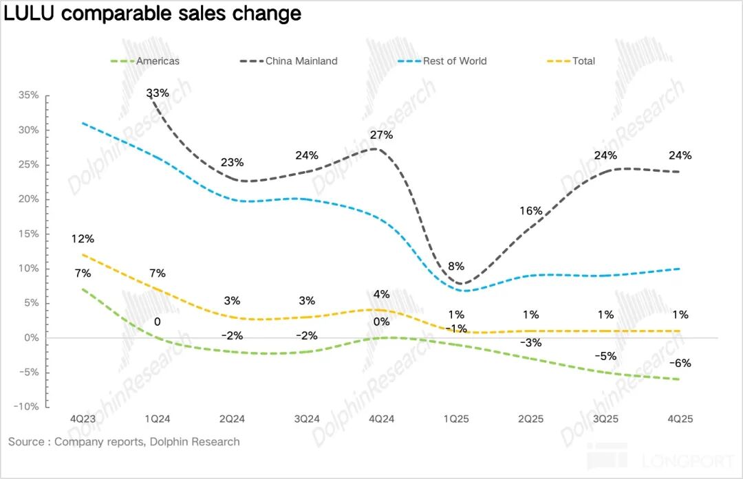 1、营收小幅超出市场预期。4Q25Lululemon 营收同比增长 0.8%,趋势上增速仍在放缓,增速为近 3 年以来最低水平。如果剔除去年同期多出的额外一周的影响,实际营收同比增长 6%,但也远低于过去几年 15% 以上的高速增长水平,核心还是北美大本营市场陷入了增长停滞。