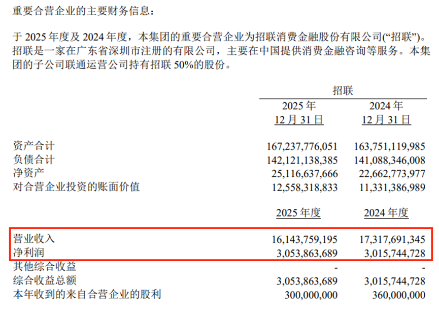 中国联通财报显示,其合营企业招联金融2025年营收161.44亿元,同比下降6.78%;净利润30.54亿元,同比微增1.26%。