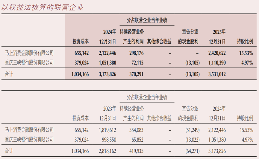 重庆银行财报显示,其2025年通过联营企业马上消费产生的净利润为2.98亿元,结合其15.53%的持股比例测算,马上消费2025年净利润约为19.20亿元,同比下滑15.79%。