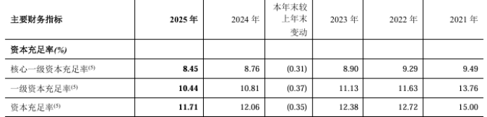 2025年,该行资本充足率、一级资本充足率、核心一级资本充足率分别为11.71%、10.44%、8.45%。2024年,该行资本充足率、一级资本充足率、核心一级资本充足率分别为12.06%、10.81%、8.76%。
