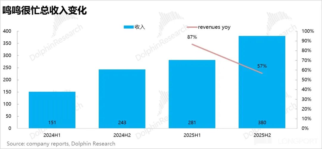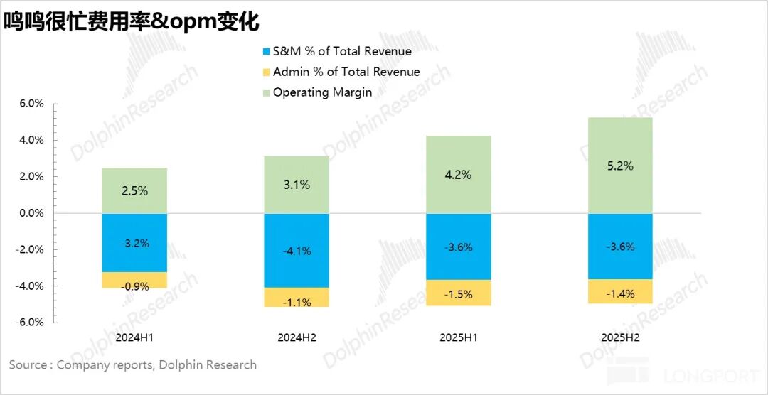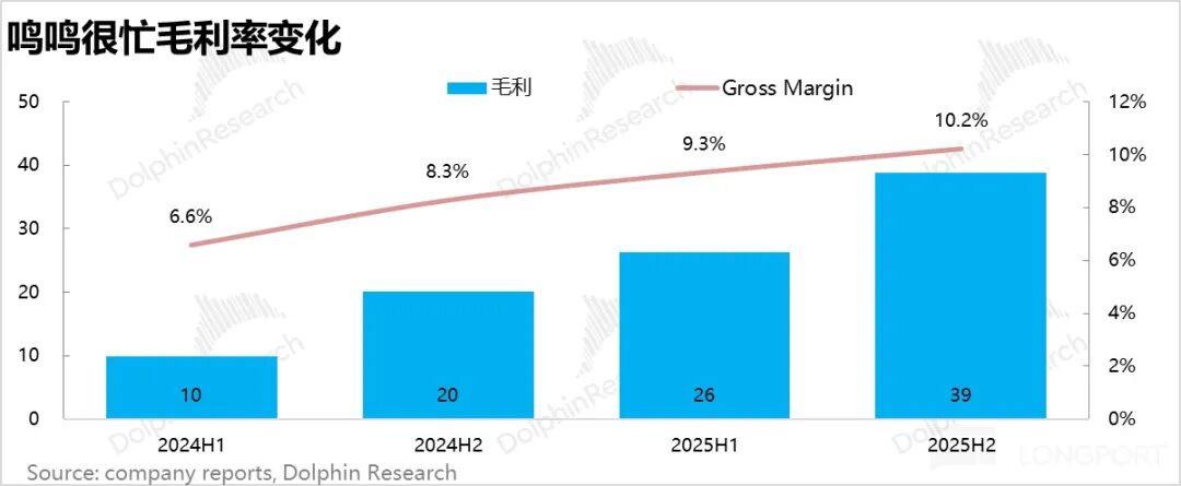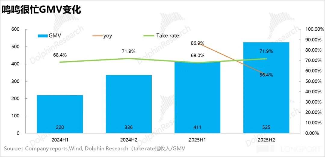 2H25,鸣鸣很忙总 GMV 达到 525 亿元,同比增长 56%;从商品销售收入/GMV 这一指标看来,下半年很忙的 Take rate 提升到 71.9%,与去年同期持平,变化并不大。