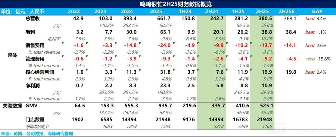 1、营收小幅超出市场预期。从整体业绩的角度,受益于高速开店,下半年鸣鸣很忙实现营收 381 亿元,同比增长 57%,明显超出市场预期。基本接近去年全年的营收体量,说明很忙仍处于高速成长阶段。