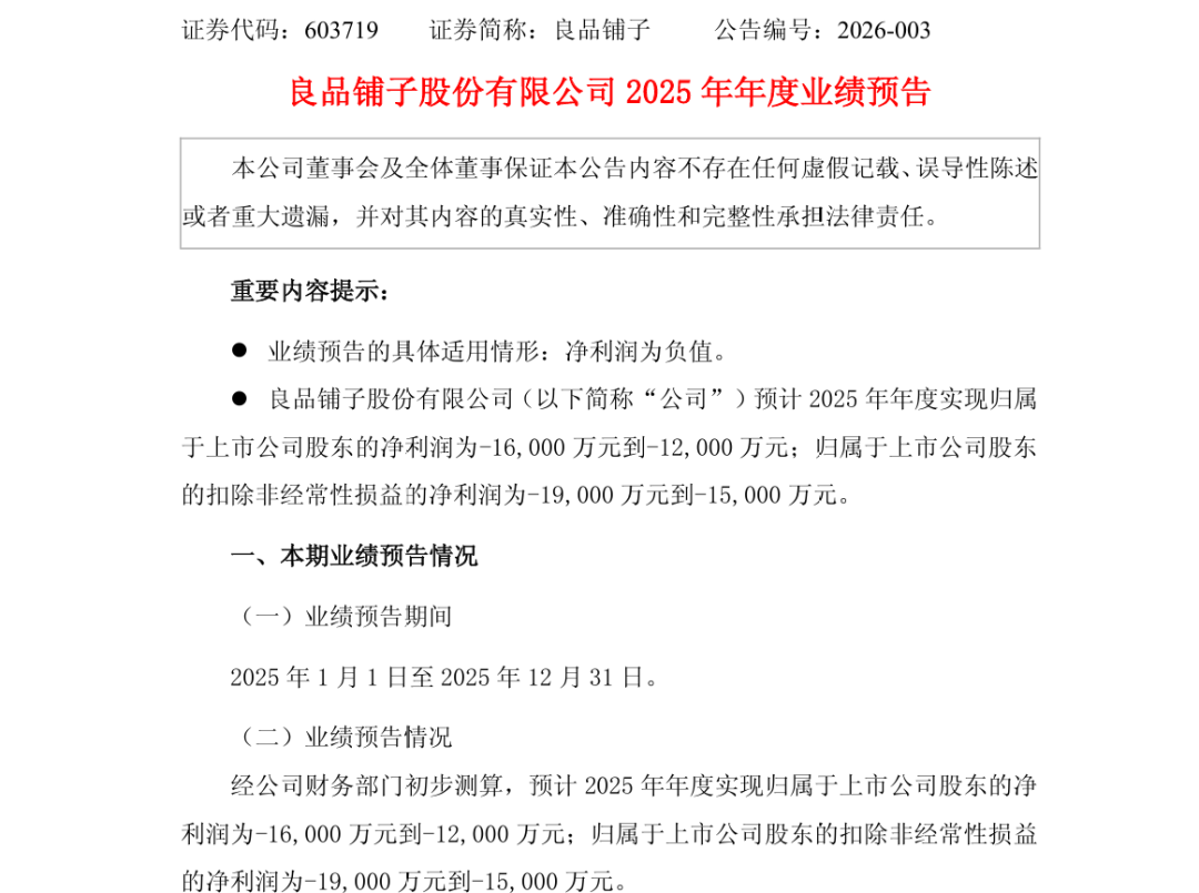 1月20日,良品铺子预计2025年实现归母净利润亏损1.2亿元至1.6亿元之间,同时,扣非净利润亏损区间为1.5亿元至1.9亿元。
