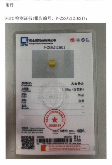 周生生在情况说明中进一步表示,2月3日,公司已将同批次同款福袋送检至国家珠宝玉石首饰检验集团有限公司(NGTC),采用X射线荧光光谱法(XRF)进行检测,该福袋货品的检测结论为足金饰品(报告编号:P-ZSSA2121621)。NGTC对该货品随机选取3个检测点,检测所得金含量结果依次为99.99%、99.99%、99.98%。随情况说明一同发布的,还有NGTC检测证书以及NGTC检测报告。