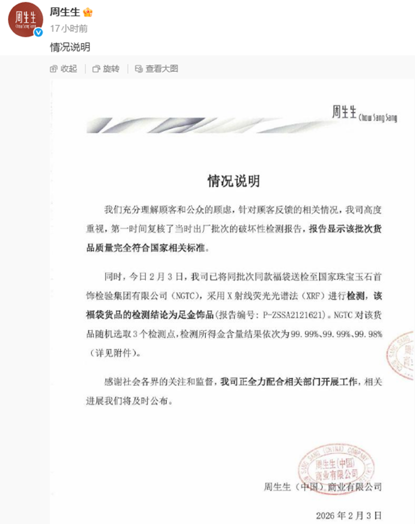 因对饰品含金量产生怀疑,李女士将挂坠送检,结果发现挂坠不同点位金含量最高与最低值相差超35个百分点,此外,挂坠中还含有铁、银、钯等其他金属元素。李女士同时检测了自己佩戴多年的其他金饰及同期购买的另一件周生生挂坠,结果均显示纯度达标。根据国家标准《GB11887 - 2024首饰贵金属纯度的规定及命名方法》,Au990(俗称足金)金含量不低于990‰,Au999(俗称千足金)金含量不低于999‰。在自行沟通退货无果后,李女士通过12315APP提交投诉。经媒体记者介入采访,周生生方面的态度发生了转变,工作人员回应称,虽初步判断非质量问题,但“出于对客户的诚意”,愿意为李女士办理退货,并可安排人员陪同前往国家认可的权威检测机构进行复检。事件经网络传播后迅速发酵,面对舆论压力,2月3日中午,周生生在官方微博表示,高度重视顾客反映的相关事宜,正积极开展相关工作。2月3日晚间,周生生再次发布情况说明,并公布同批次同款产品检测报告。周生生称,针对顾客反馈的相关情况,公司高度重视,第一时间复核了当时出厂批次的破坏性检测报告,报告显示该批次货品质量完全符合国家相关标准。