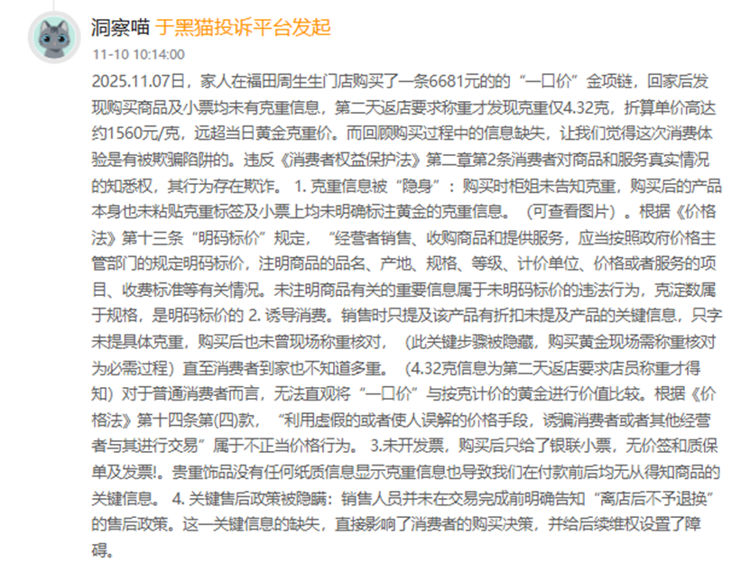 此外还有消费者反映,在周生生重庆北城天街店购买了两款一口价黄金挂坠,总价3555元。购买时,销售告知我饰品金重为“两点多克”,但实际金重仅1.6克;且全程未给我查看饰品标签,刻意隐瞒了克重和定价信息。我发现问题后,要求退货退款或换按克计价的素金饰品,但门店以“离店不退”为由无理拒绝,仅同意换同价一口价饰品。