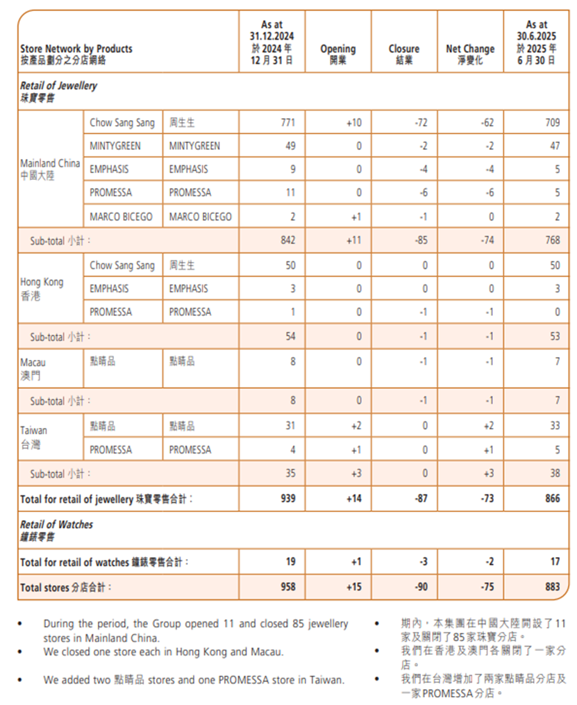 门店端,周生生亦延续了收缩趋势,2025年上半年,其在中国内地的各类品牌门店就净减少74家(新开11家,关闭85家),其中主品牌“周生生”净关店62家,从771家降至709家。公司预计2025年年底门店数量将较2024年减少10%。2025年上半年,周生生在中国大陆的珠宝零售收益为72.49亿港元,同比下降2%,而香港及澳门则下降6%。其中,大陆和港澳镶嵌珠宝同店销售额分别暴跌23%和22%。2025年上半年,周生生的毛利率上升5.2个百分点至33.5%。期内,由于金价持续上涨,黄金商品的销售获得较高的毛利率。透过分店网络的重整及其他成本控制措施令成本降低,亦为溢利增长带来贡献。此外,毛利率提升的另一个原因是集团调整了产品组合,偏向高毛利的商品。2025年以来,国际金价持续攀升,周生生、周大福、潮宏基、老铺黄金等多个黄金珠宝品牌的定价黄金饰品均多次调价。其中,周生生部分定价产品在2025年9月底进行了调价。2025年10月16日,周生生部分定价产品再次调价,涨幅控制在25%至35%的范围内。2026年1月6日,周生生再次涨价,此次涨价幅度在200元至1500元不等,调价产品主要包括转运珠、定价联名款(如HelloKitty系列)以及金镶钻类饰品。此次调价也使周生生成为2026年开年以来,首家明确对定价金饰公开调价的黄金珠宝品牌。据不完全统计,从2025年9月到2026年2月期间,周生生产品6个月时间里进行了三次提价。