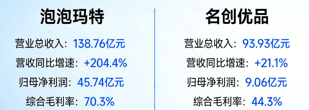 泡泡玛特以不够名创优品一成的门店数量,刷出营收、盈利的全面压制,双增速都是倍速增长,高毛利率的自有IP潮玩正是爆发的核心逻辑。