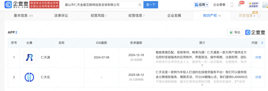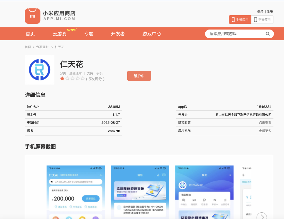 小米应用商店显示,仁天花更新时间为2025年8月27日,运营方为眉山市仁天金服互联网信息咨询有限公司。目前该APP显示“维护中”。值得注意的是,该公司不具备任何金融牌照。