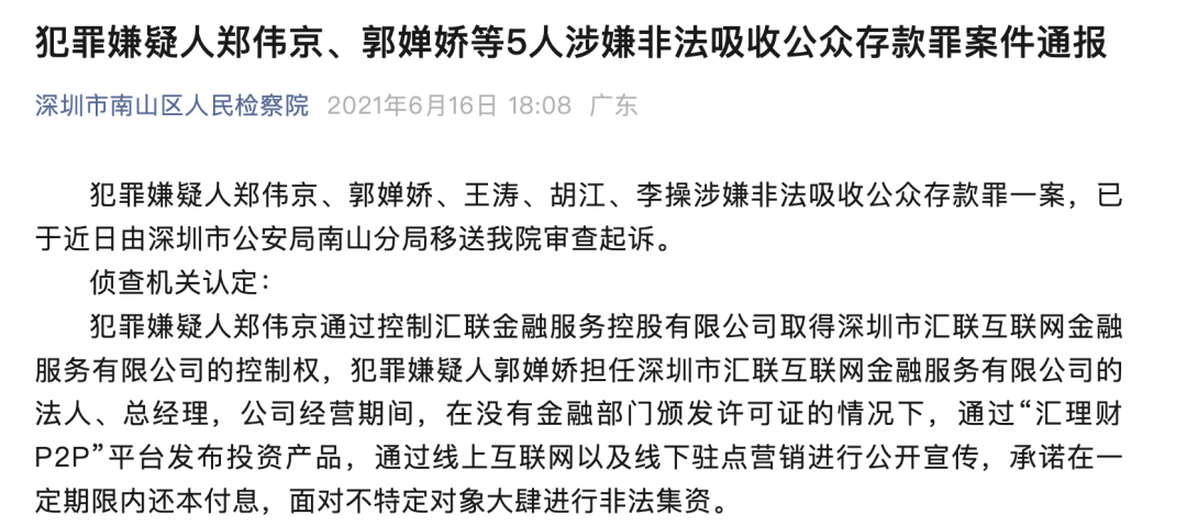 2021年6月16日,深圳市南山区人民检察院官方微信发布消息,称犯罪嫌疑人郑伟京、郭婵娇等五人涉嫌非法吸收公众存款罪一案,已于近日由深圳市公安局南山分局移送检方审查起诉。
