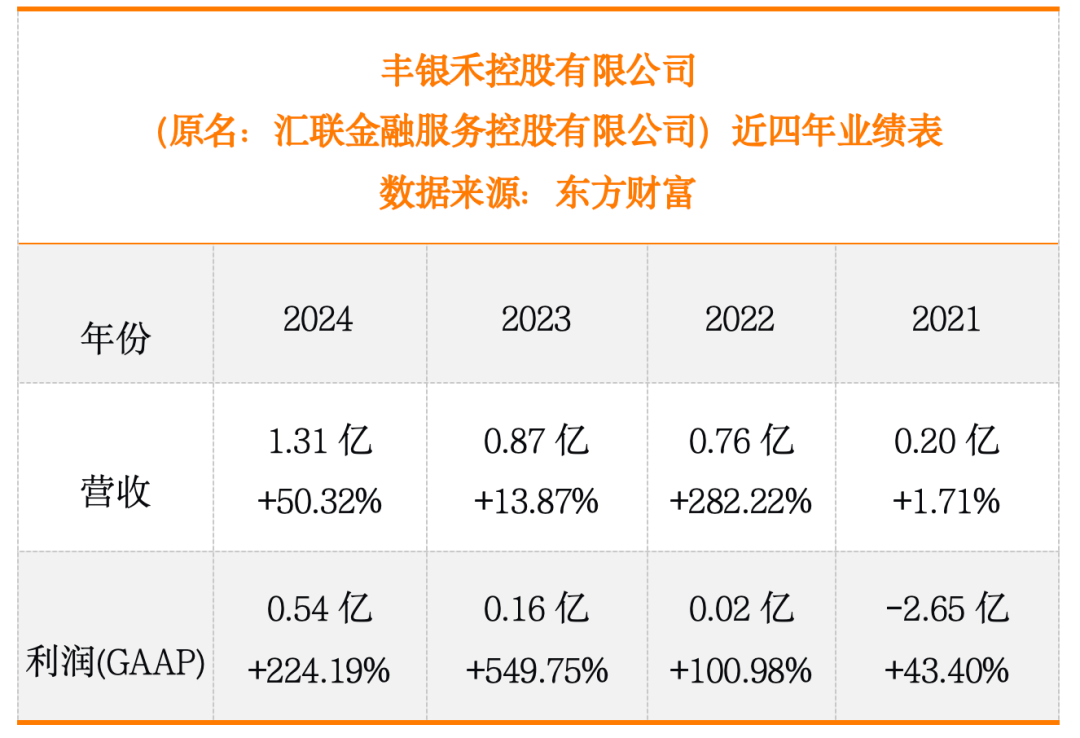 根据东方财富网的信息,2021年-2024年,丰银禾控股的净利润分别为-2.65亿元、0.02亿元、0.16亿元和0.54亿元,增速分别高达43.40%、100.98%、549.75%和224.19%。