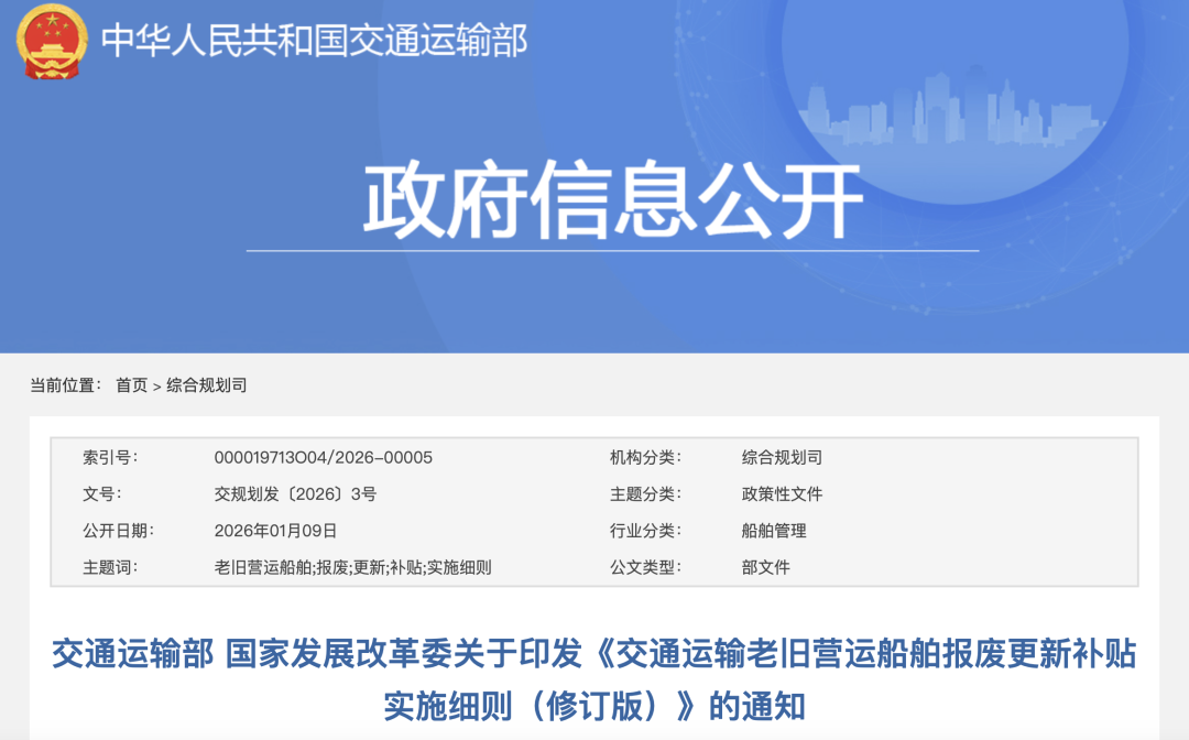 近日,交通运输部联合国家发展改革委发布《交通运输老旧营运船舶报废更新补贴实施细则(修订版)》,对2024年8月出台的初始政策进行系统性优化。新细则明确补贴实施期为2024年8月2日至2028年12月31日,并对船东资质、拆解条件、新建标准、审核流程及监管机制等作出多项调整。