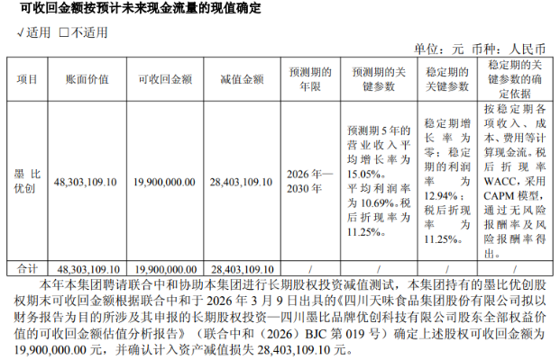 与此同时,公司计提资产减值损失3100万元,其中对联营企业墨比优创的长期股权投资减值损失达2840万元。公开资料显示,天味食品于2023年3月领投墨比优创亿元级A轮融资,目前持有其约9.95%股权,后者旗下拥有“马路边边串串香”“老街称盘麻辣烫”等餐饮品牌。2025年,墨比优创陷入“增利不增收”困境:实现净利润1427.14万元,同比微增0.78%,但营业收入同比大幅下滑38%至1.24亿元。因此,营收规模的萎缩或是本次资产减值的关键诱因。