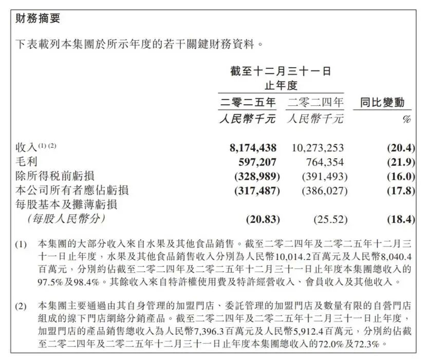 继2024年亏损后,百果园在2025年仍未扭亏,当期亏损达3.17亿元人民币(下同),连续两年累计亏损约7.03亿元,营收同比降超20%至81.74亿元。