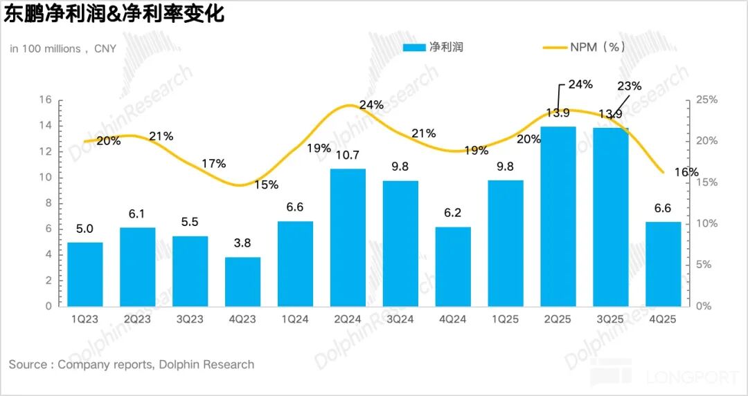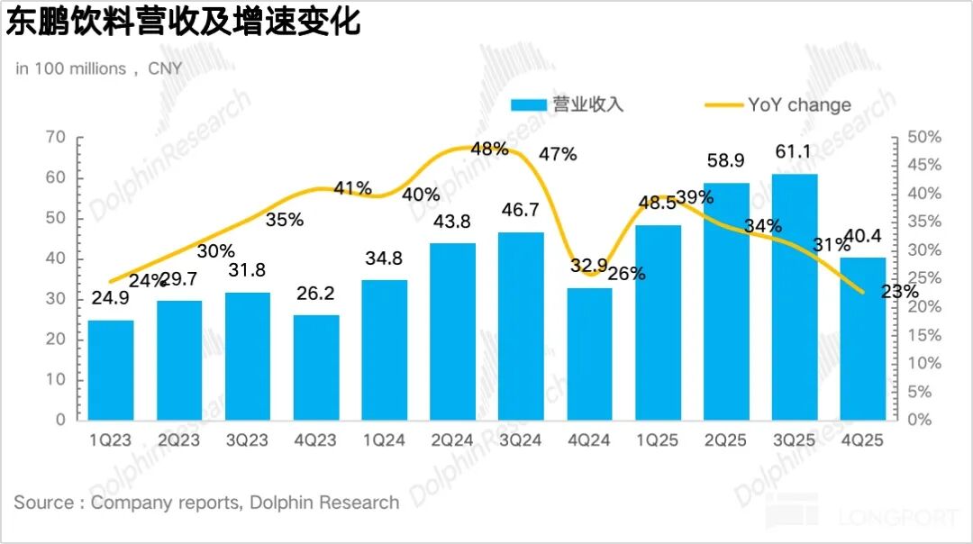 1、营收持续降速:4Q25 东鹏饮料实现营收 40.4 亿元,同比增长 22.6%,从趋势上看经历了从一季度开始连续的换挡降速,核心原因还是海豚君不断强调的东鹏正处于特饮面临增长瓶颈而 “第二曲线” 由于低基数原因填补不了特饮增速下滑的 “青黄不接” 阶段。