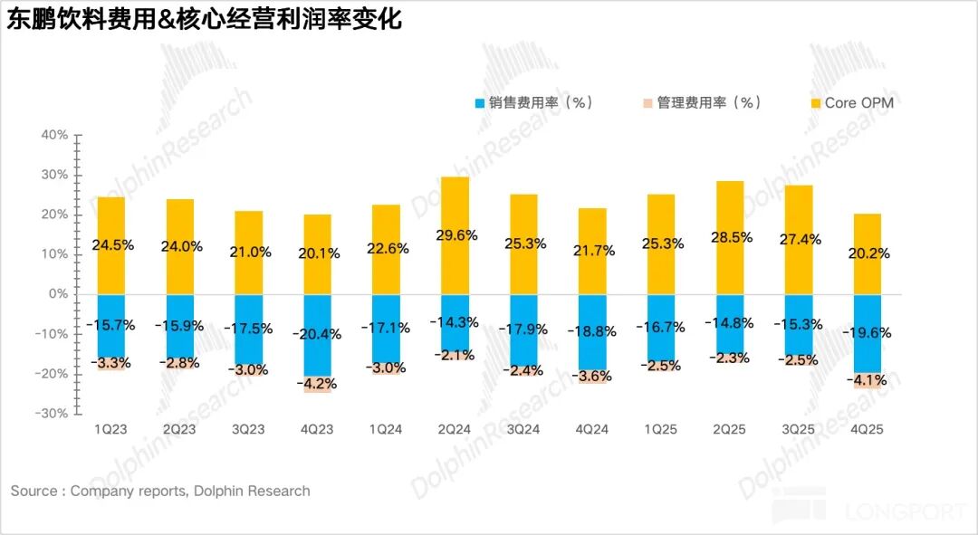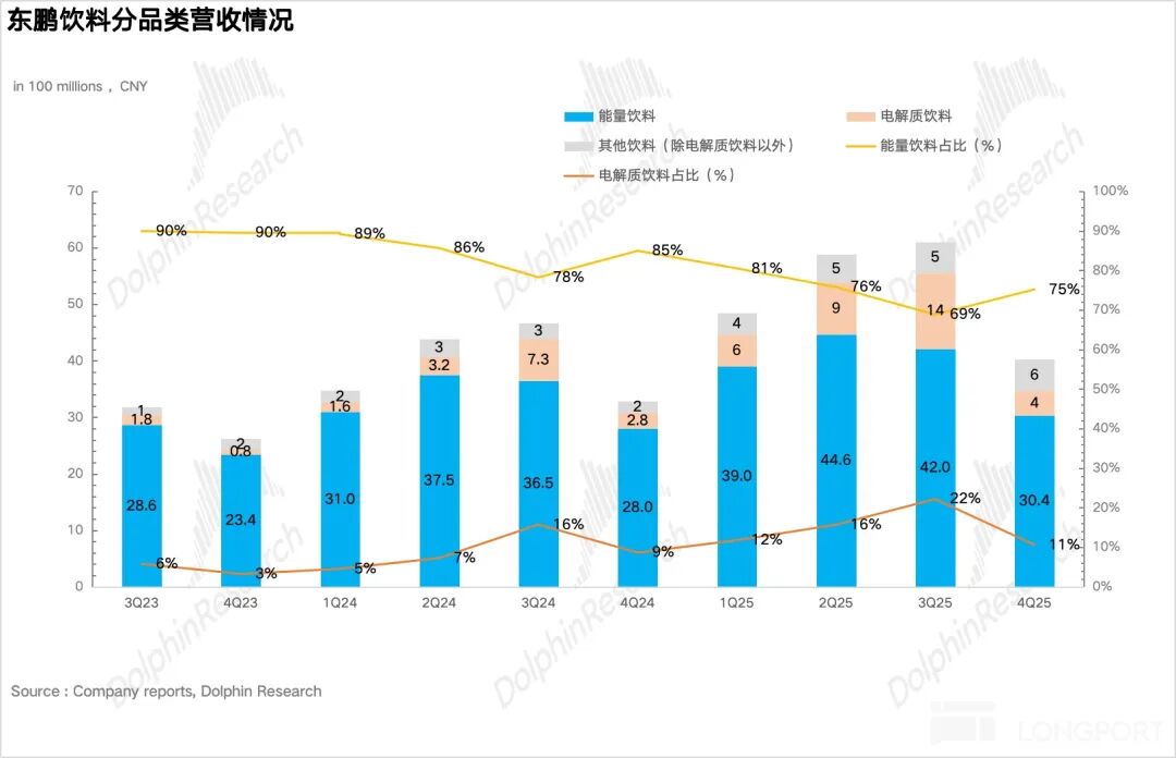 拆分品类看,4Q25 能量饮料实现营收 30.4 亿元,同比增长 8.5%,单季度增速进一步新低,除了自然增长放缓外,海豚君推测也和四季度公司组织架构调整、内部团队处于磨合期,东鹏主动放缓了发货节奏有关。