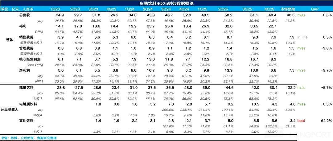北京时间 3 月 30 日晚间,东鹏饮料(605499.SH)发布了 2025 年四季度业绩。整体上,在基本盘能量饮料持续降速的情况下,公司业绩表现仍然一般,多项核心经营数据均低于市场预期,具体要点如下: