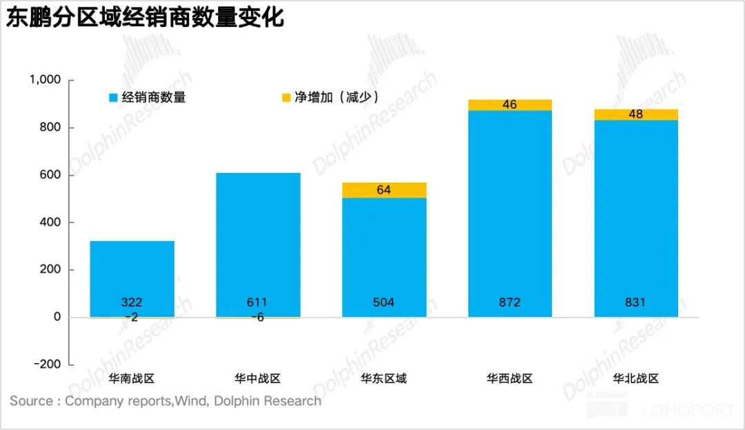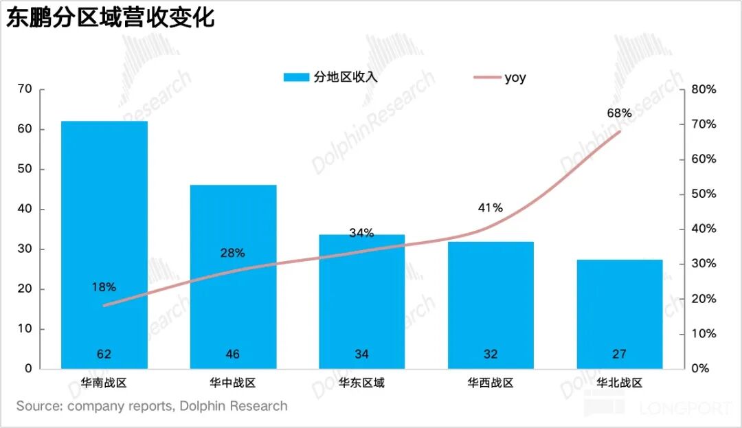 分区域来看,由于公司变更了披露口径(大本营广东并入了华南战区),但海豚君结合调研信息推测,两广地区在网点极度成熟的情况下只有低个位数的增长,而华北(京津冀、鲁豫)和华西(川渝、西北)战区由于网点密度远低于南方,仍处于渗透率快速提升阶段。