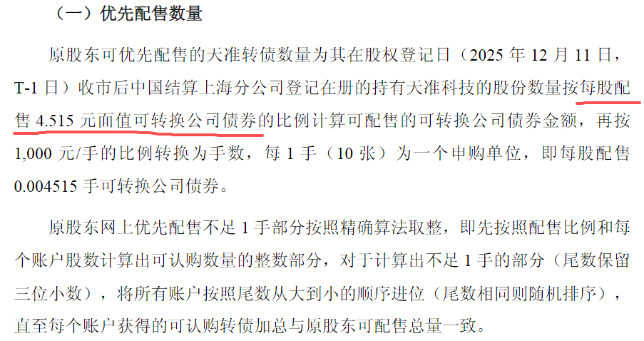理论上,至少有1000/4.515=222(股,向前取舍)才能配售10张(1手)可转债,按股票规则,即若想获得原股东的优先配售权,则需在2025年12月11日持有300股天准科技。