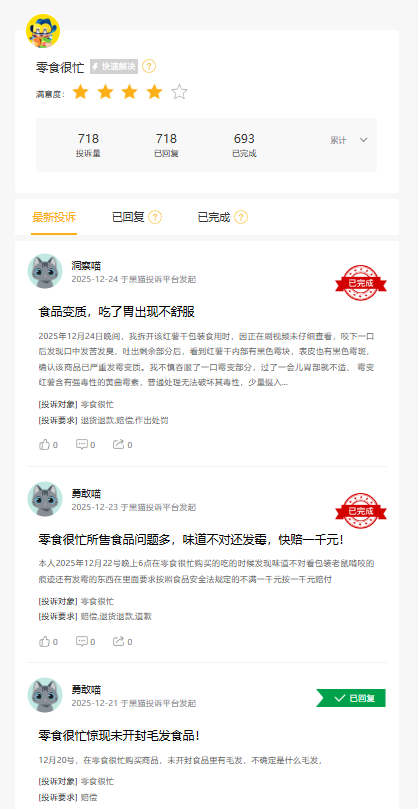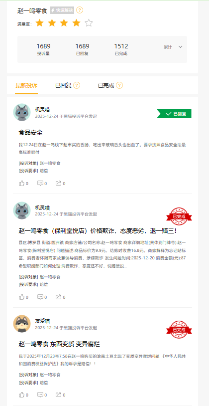 浏览黑猫投诉,截止2025年12月24日,赵一鸣零食累计相关投诉1689条、零食很忙为718条,质疑主要涉及产品质量、售后服务等方面。