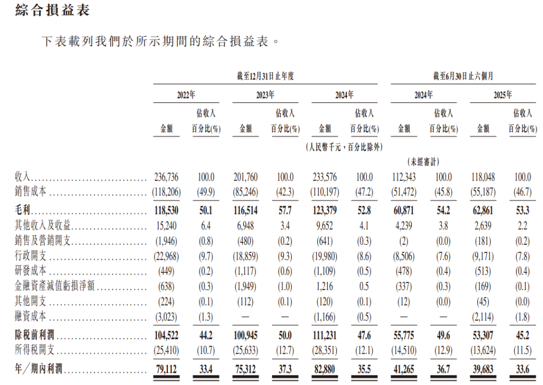 净利润表现同样稳健,2022年至2025年上半年,公司净利润分别为人民币7,911万元、7,531万元、8,288万元及3,968万元,净利润率始终维持在33%以上。