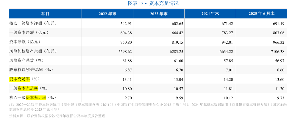 联合资信在《2025 年二级资本债券信用评级报告》指出,2025 年以来,随着业务发展,长沙银行风险加权资产规模有所上升,但得益风险系数较高的资产规模的压降,风险资产系数下降,整体资本充足率略有下降,仍保持充足水平。