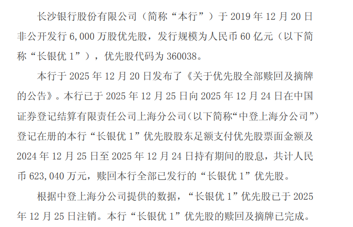 2025年12月26日晚,长沙银行公告称,于2019年12月20日非公开发行的6000万股优先股(发行规模60亿元,简称“长银优1”)已于2025年12月25日完成注销,累计支付票面金额及股息共计62.304亿元,并正式摘牌。