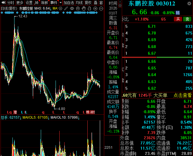 股价大跌,机构、散户均有所减少。二级市场上,东鹏控股股价下滑较为明显,从2023年12.43元/股(前复权,下同)的高点下滑至4.8元/股的低点,随后有所反弹,截至1月7日收盘,股价为6.66元/股,较高点下跌约46%,目前总市值不足百亿元,为77.05亿元,TTM市盈率20.89%,考虑到房地产业现状以及公司收入下滑的情形,估值并不算太低。
