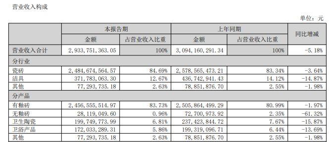 进一步来看,瓷砖包括有釉砖、无釉砖,前者是收入重头,2024年、2025年上半年收入分别为52.59亿元、24.57亿元,同比下滑16.42%、1.97%,而无釉砖收入则是连续多年下滑,2022年至2025年上半年分别为4.26亿元、2.9亿元、1.29亿元、0.28亿元,同比分别下滑43.9%、31.93%、55.65%、61.32%,占比从6.14%下滑至0.96%。