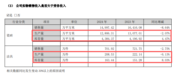 公司在2024年已经缩减了产量,不过因为销售量下滑更大的原因,导致瓷砖、洁具库存量有所增长,虽然中报未披露最新具体产销量数据,但结合收入下降来看,或将延续去年下滑的态势。