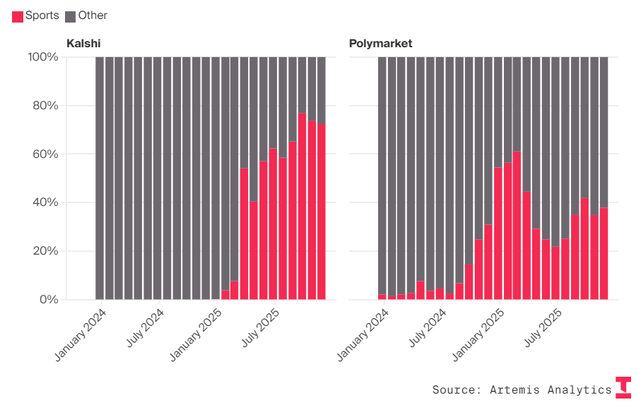 Kalshi表现亮眼:其体育预测交易量现已占其月交易总额近四分之三,而Polymarket的交易主要集中在其他领域。(数据来源:Artemis Analytics)