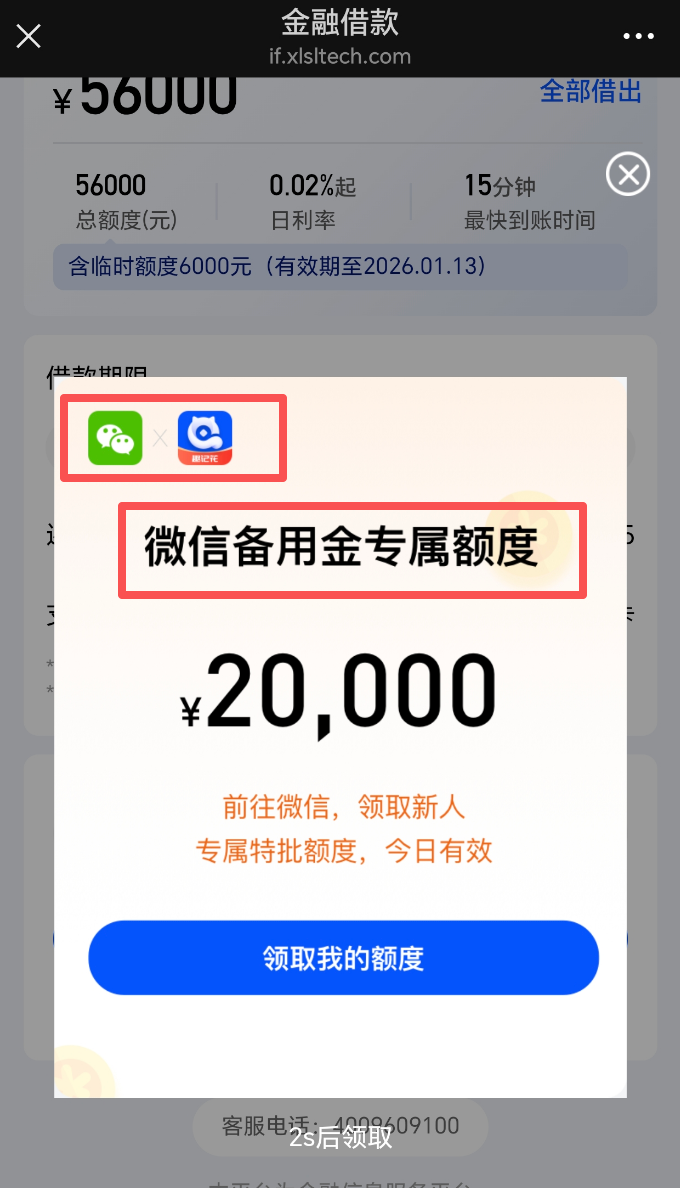 这些账号有一些特性:注册地或IP属地各不相同,但都在账号的菜单栏建立了三个借款入口,其中一个入口指向了名为“乐小钱”的产品,《读懂数字财经》从另外一个入口退出后,弹出了一个页面,该页面有明确的“微信备付金专属额度”字样,且还有内容暗示:微信与“趣记花”合作。