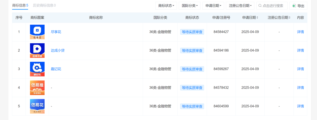 虽然,以达成小贷为主体注册的公众号多达几十个,但是该公司在天眼查只有5个商标信息,分别为:尽享花、达成小贷、趣记花以及借易推和借易花。