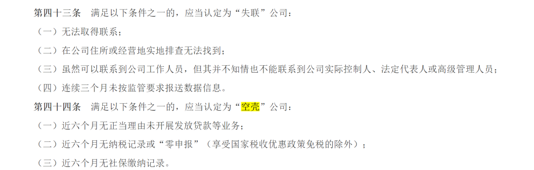 同时《办法》第四十三条、四十四条对失联、空壳小贷公司给出了认定标准。