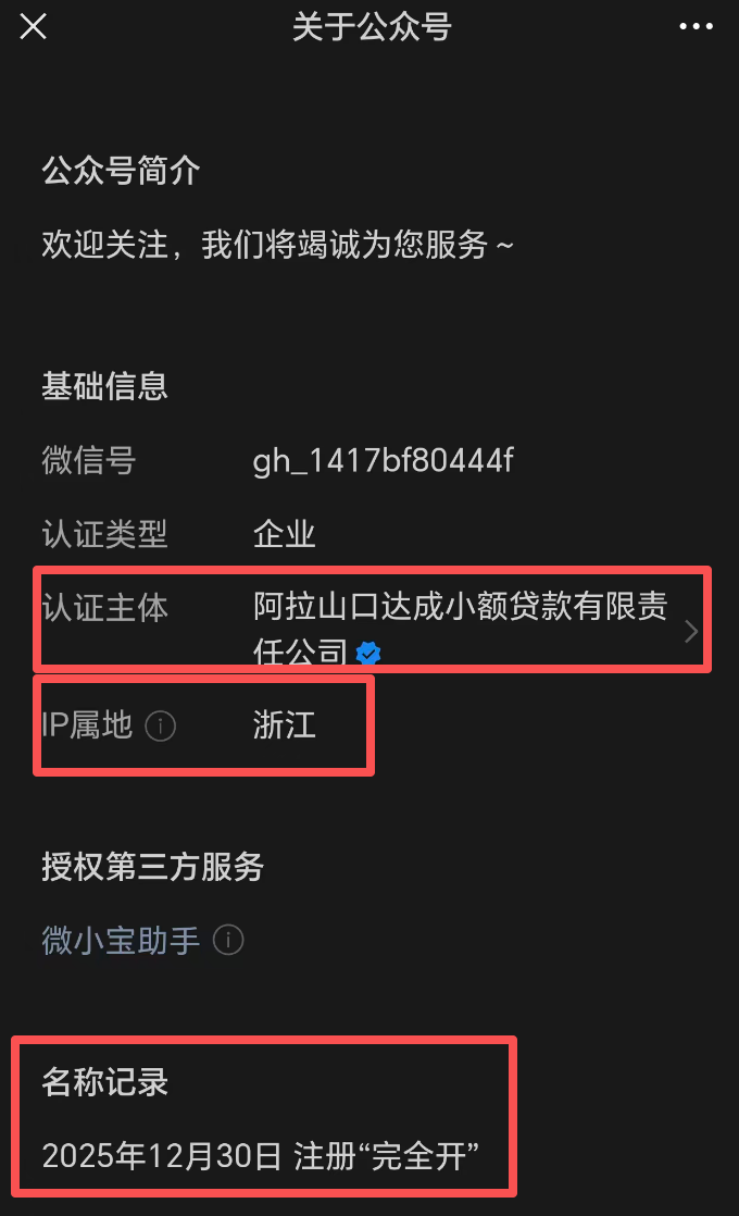 2、通过查询可知,微信上确实有名为“完全开”的服务号,其认证主体为“阿拉山口达成小额贷款有限公司”(下称“达成小贷”)。