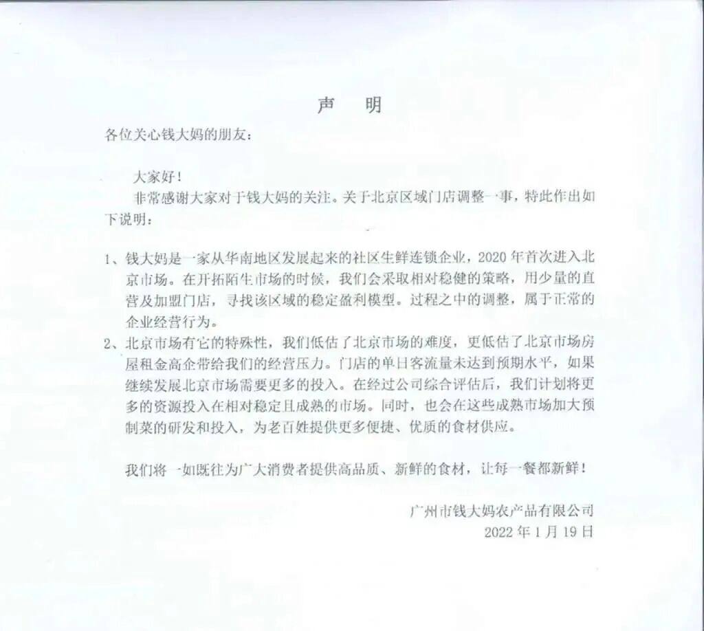 2022年,钱大妈发布声明,承认低估了北京市场的难度。