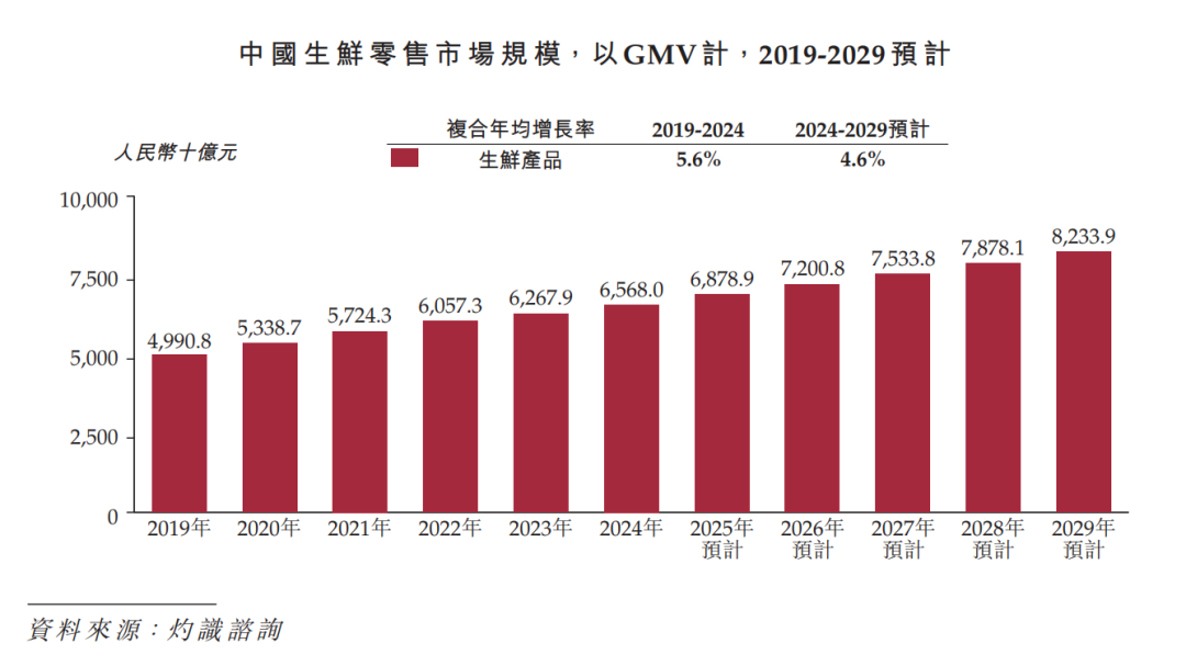 中国生鲜零售市场规模庞大,2024年以达6.6万亿元,预计进一步快速增长至2029年的8.2万亿元。