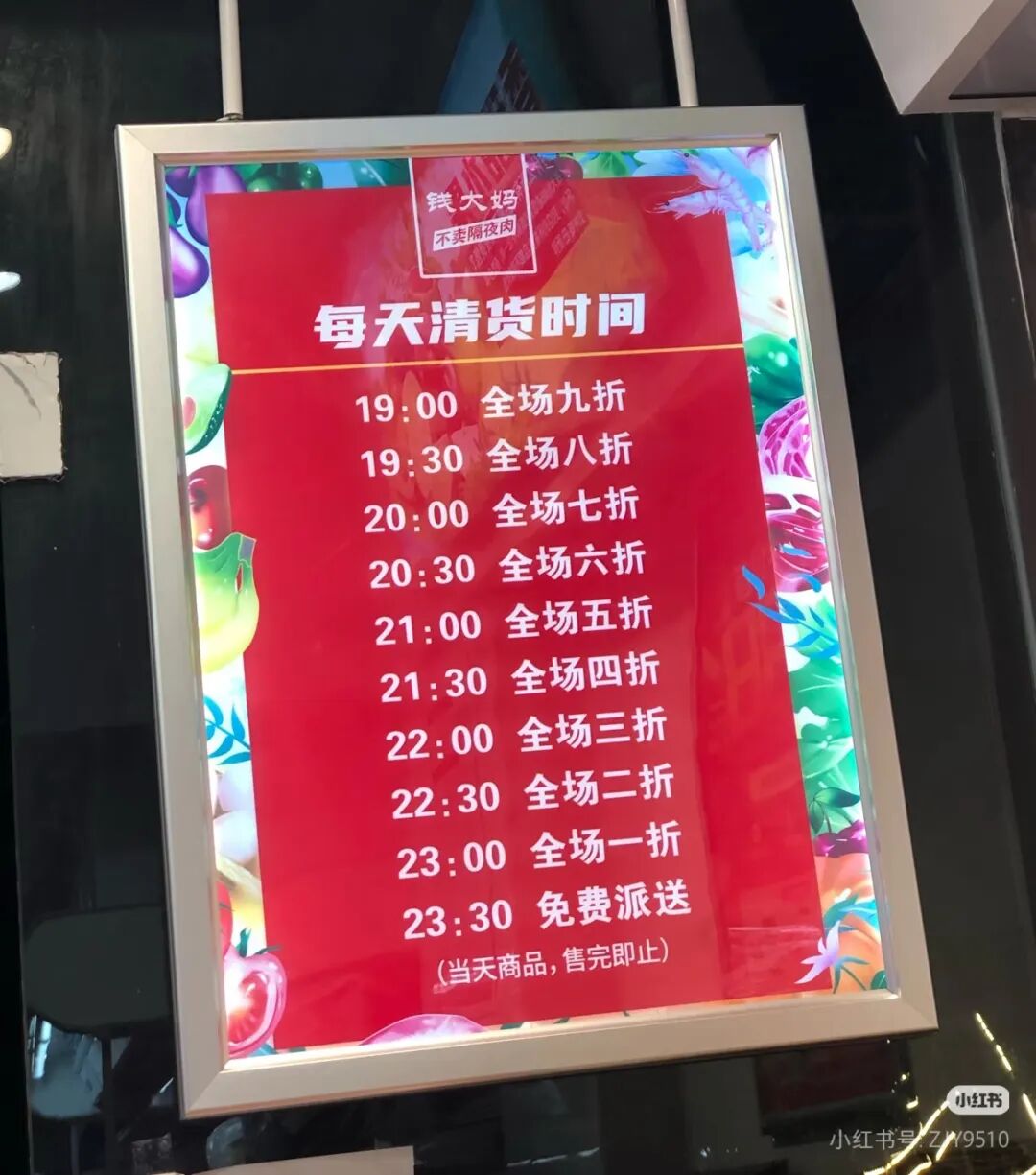 旗下门店从每日下午7点开始打九折,之后每隔30分钟增加一折,直到晚上11点30分,将剩余产品免费赠送。
