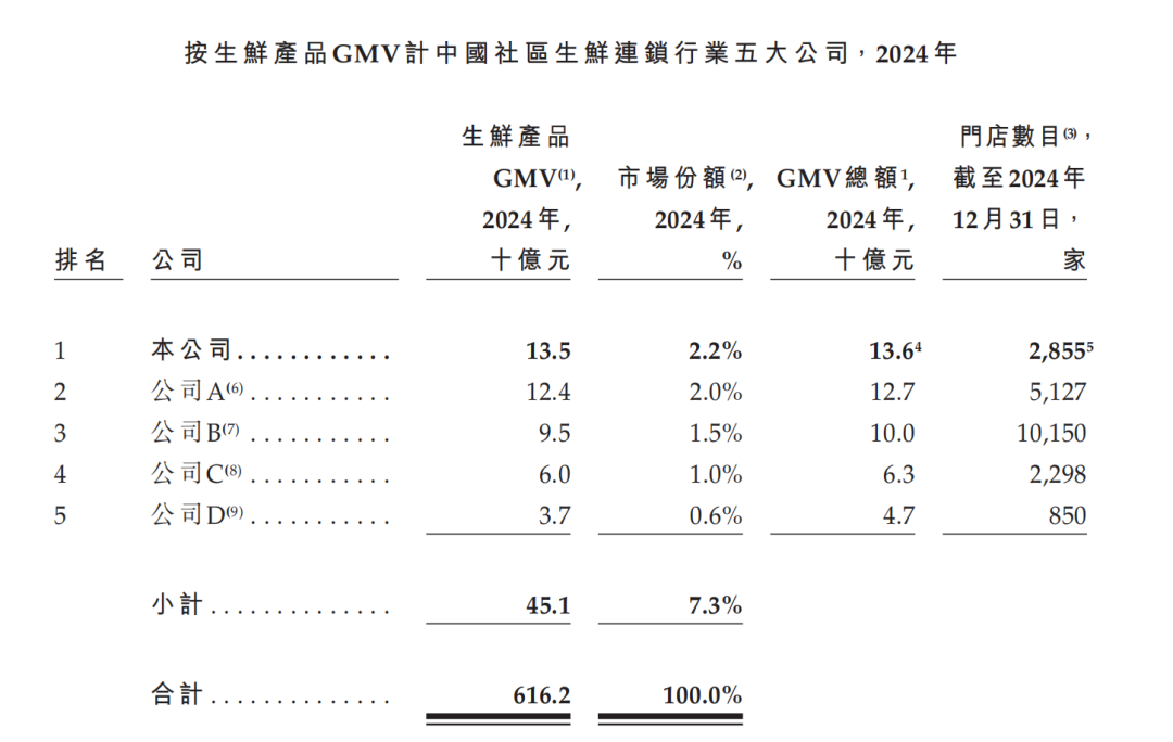 根据灼识咨询资料,以生鲜产品的GMV计,钱大妈已连续5年位居中国社区生鲜连锁企业第一。2024年,公司整体GMV达到148亿元,其中,生鲜产品GMV 135亿元,占中国社区生鲜连锁市场份额的2.2%。