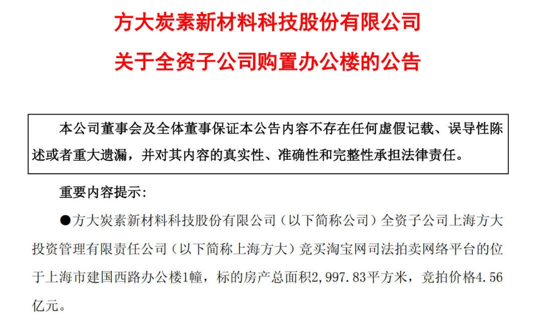 1月13日,上市公司方大炭素(600516.SH)发布公告称,公司全资子公司以4.56亿元购入上海建国西路一幢办公楼,以满足上海方大业务需要。