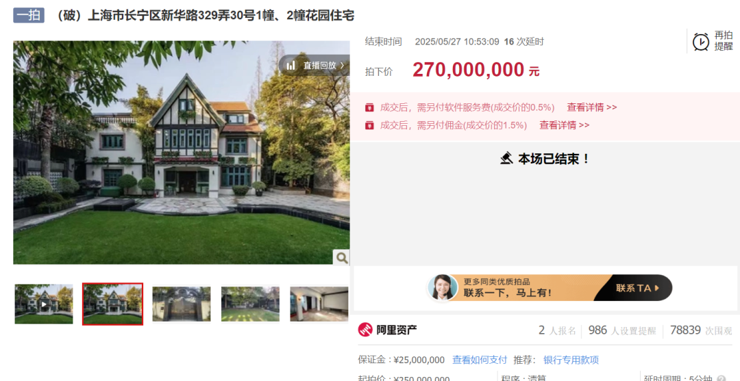 根据行业信息透露,除了建国路319号,华董中国旗下另一栋洋房会所于今年5月也进行了拍卖。该栋建筑位于长宁区新华路,类型为花园住宅,建筑面积530余平方米,经历19轮竞价最终以2.7亿成交,楼面价超50万元/平方米。