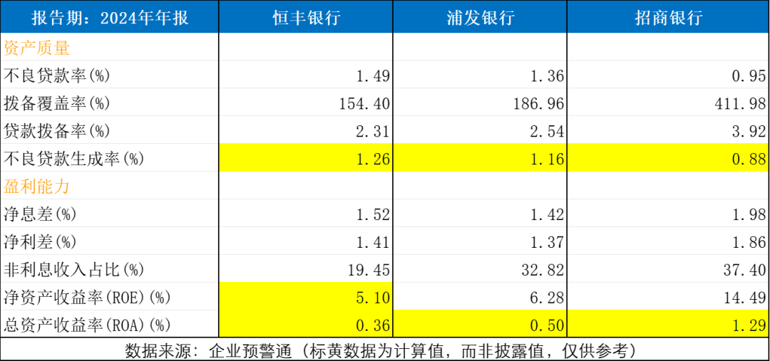 从下图来看,恒丰银行资产质量不及浦发银行,盈利能力各有千秋,但核心的ROE、ROA指标也较浦发银行有不小的差距。至于与招商银行相比,的确没有比较的必要。